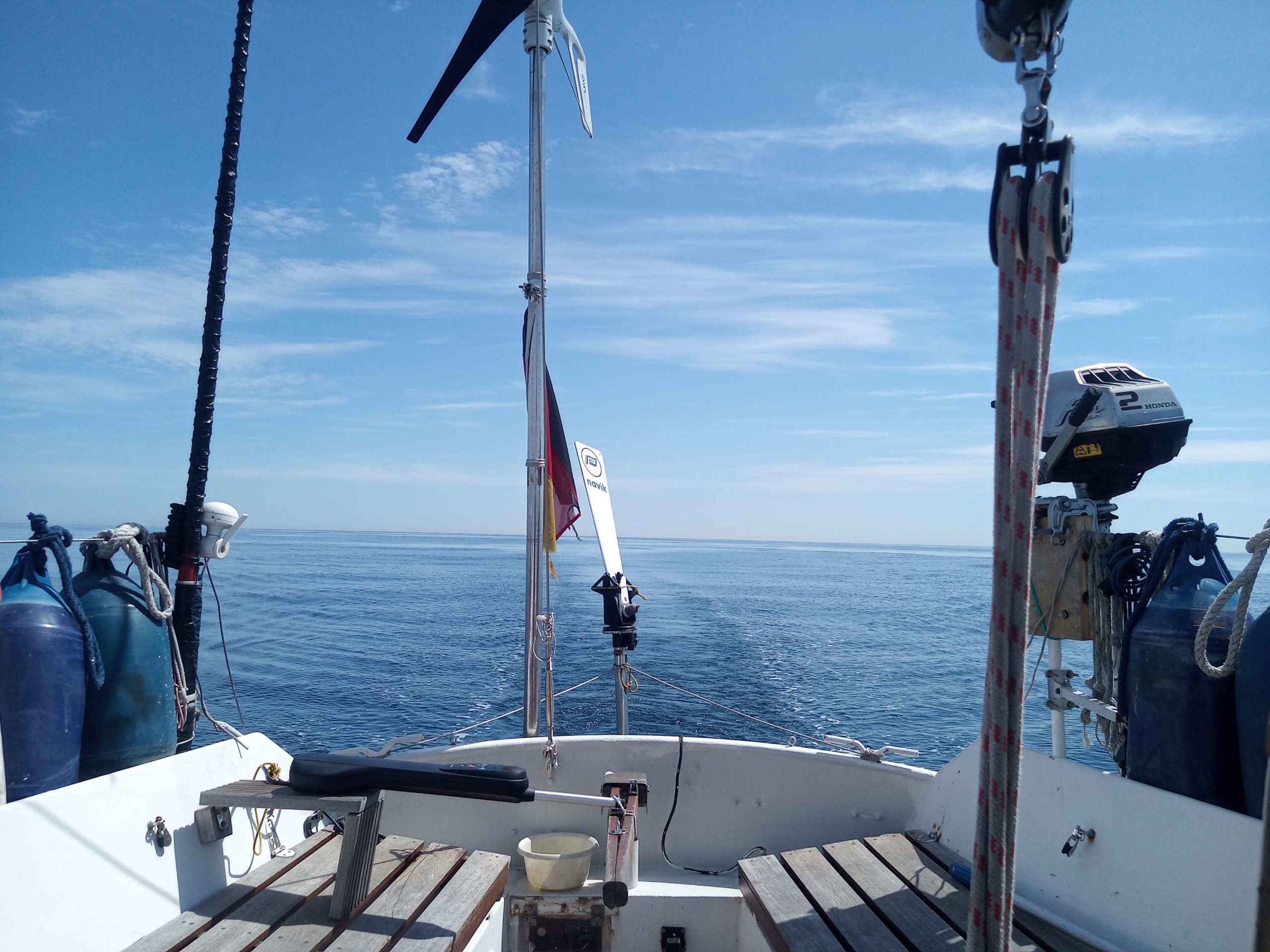 Montag, 15 Uhr 00 – langsam kommt der West auf, zur Zeit stehen wir auf der Stelle wegen starker Gegenstroemung 10 Seemeilen noerdlich von Cap de La Hague. Um 18 Uhr kentert der Strom, dann heisst es Autobahn – noch 135 Seemeilen bis zum unserem geliebten Atlantik … InschAllah! 🙂